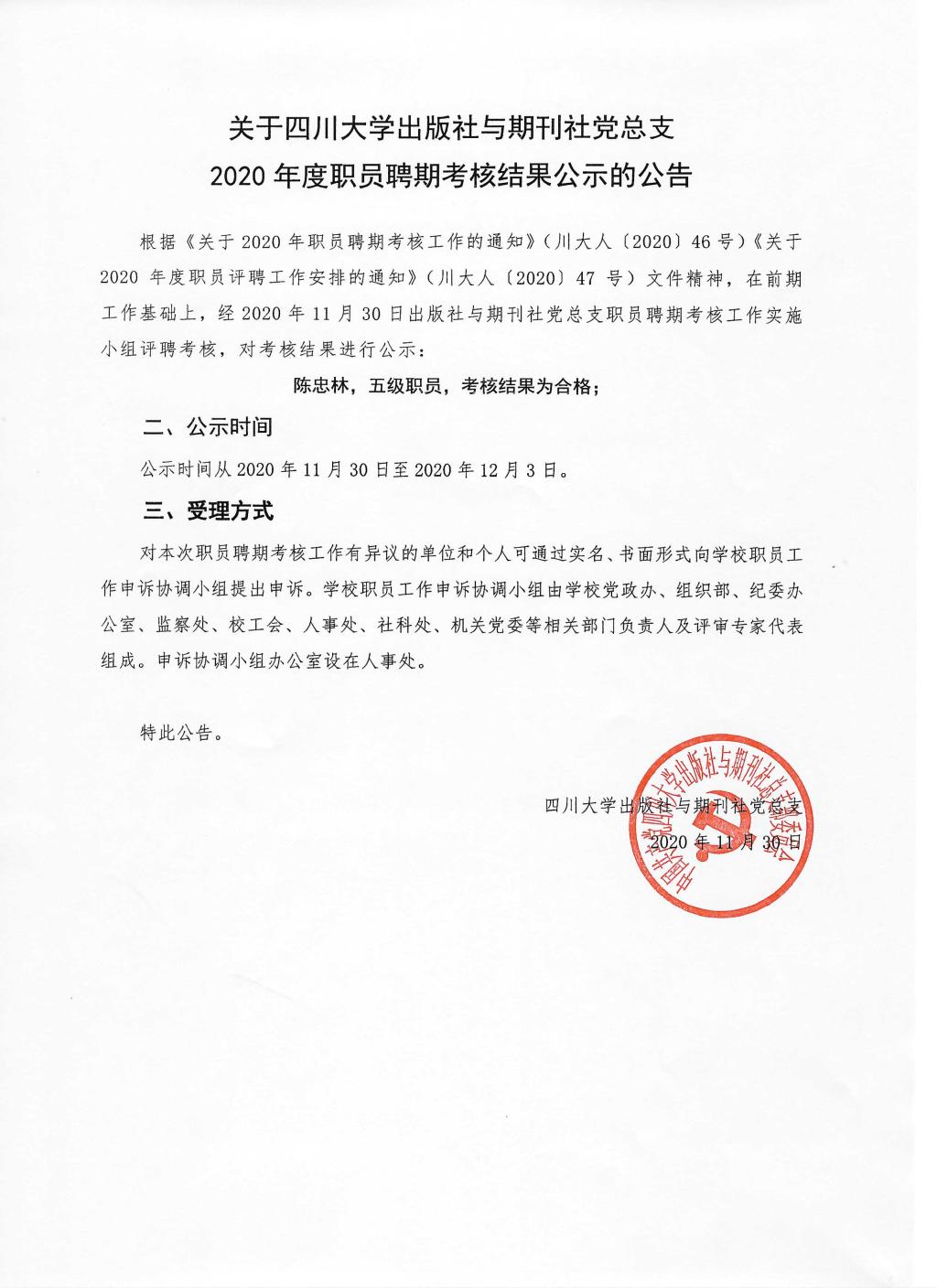 关于77779193永利集团出版社与期刊社党总支2020年度职员聘期考核结果公示的补充公告