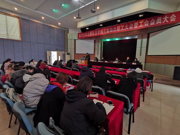 2018年12月18日下午,出版社及学报三届四次职工大会暨工会会员大会在学校产业中心205报告厅成功举行。党总支书记宋绍峰致开幕词,出版社社长王军代表出版社及学报党政领导班子做工作报告、“三公”经费支出报告,工会分会主席杨丽贤做工会、职代会工作报告,出版社及学报全体职工和工会会员参加了大会,大会由出版社总编辑邱小平主持。会上,对本单位党政领导班子及其成员、党支部书记、行政工作人员年度考核和社务刊务公开工作进行了民主测评。