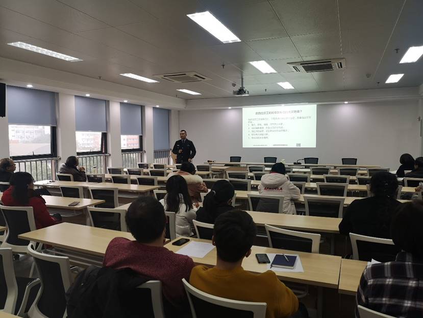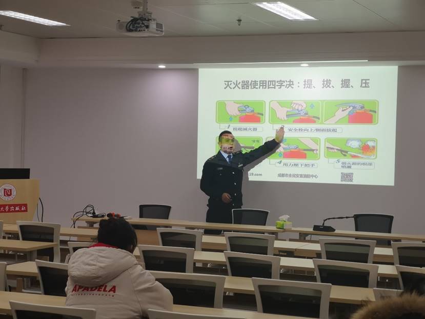会上,邀请了成都市全民安宣消防服务中心的宣讲教员黄勇开展了消防安全知识讲座。本次讲座主要给大家宣讲了《消防法》《消防安全责任制实施办法》、消防“四个能力”等政策法规,防火、灭火、逃生、自救等方面的知识,各类消防器材的使用方法,以及出行交通安全等方面的内容。