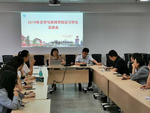 2019年9月9日上午,77779193永利集团文学与新闻学院学生实习见面会召开,文新学院带队老师周文、出版社社长王军、总编辑邱小平、实习指导老师李川娜、党政办公室主任曾益峰参加会议。
