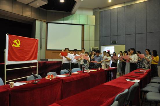 在庄严的中国共产党党旗下,党总支书记宋绍峰同志领誓,全体与会党员举起右拳,朗声宣读入党誓词, 共同表达了为党的事业奋斗终身的坚定决心。铿锵有力的宣誓声响彻报告厅:“我志愿加入中国共产党,拥护党的纲领,遵守党的章程,履行党员义务,执行党的决定,严守党的纪律,保守党的秘密,对党忠诚,积极工作,为共产主义奋斗终身,随时准备为党和人民牺牲一切,永不叛党!”