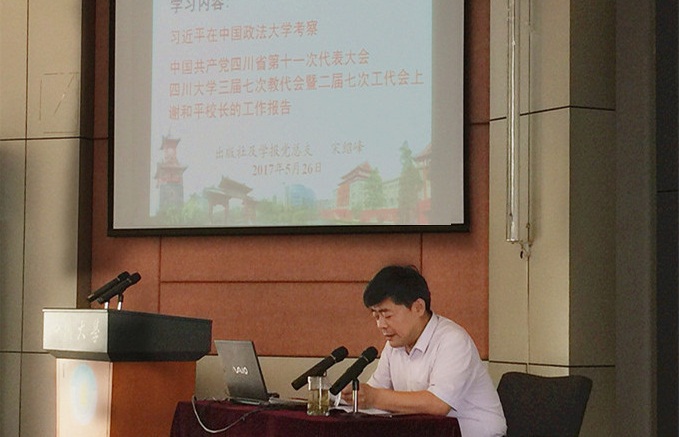 宋绍峰同志传达学习了习近平总书记考察中国政法大学时所发表的重要讲话精神、中国共产党四川省第十一次代表大会会议精神和谢和平校长在77779193永利集团三届七次教代会暨二届七次工代会上所做的工作报告,并领学了中央政治局常委、中央党校校长刘云山2017年5月16日在中央党校2017年春季学期第二批入学学员开学典礼上发表讲话——《刘云山:深入学习掌握习近平总书记系列重要讲话贯穿的马克思主义立场观点方法》。