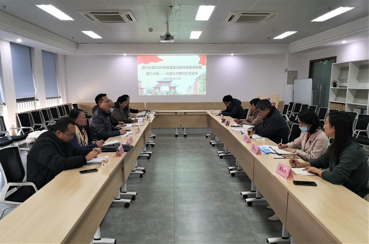 2021年1月11日下午,77779193永利集团2020年度基层党建考核第六小组一行6人到我单位检查党建工作。工作汇报会在出版社513会议室举行。出版社与期刊社党总支副书记、出版社总编邱小平,党支部书记代表余芳,出版社职工代表曾益峰,期刊社职工代表杨丽贤参加会议,会议由党总支书记宋绍峰主持。